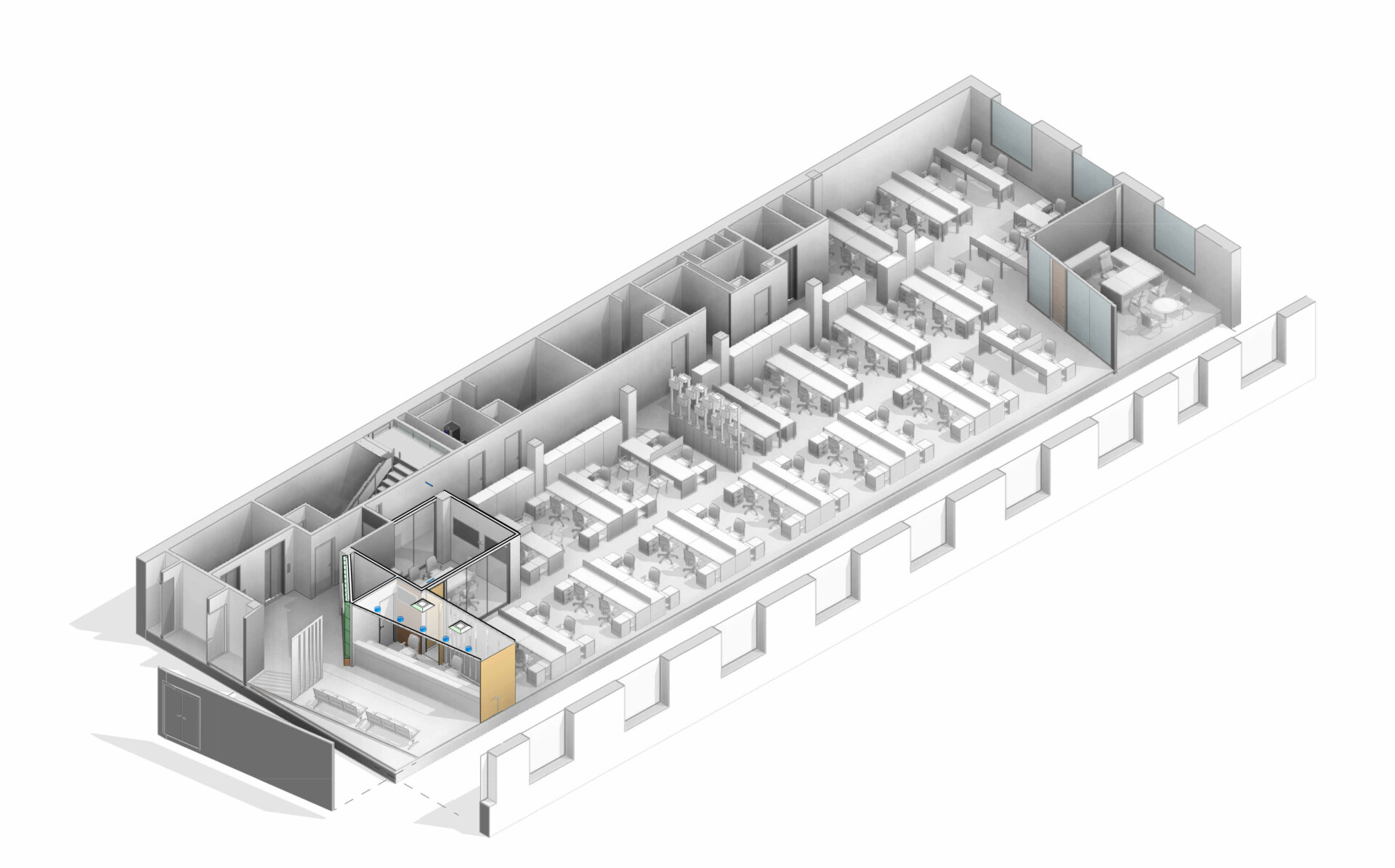 Renovación de espacios interiores en edificio de oficinas. Modelado integral y modelado de instalaciones MEP para detección de interferencias.